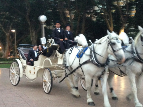 黄昏十分,散步,这个有着200多年历史的市中心公园有着大片的草坪和百年以上的参天大树,忽闻一阵马蹄声,原来遇到婚礼,马车上的新郎新娘好像从童话世界走出来,祝福他们~