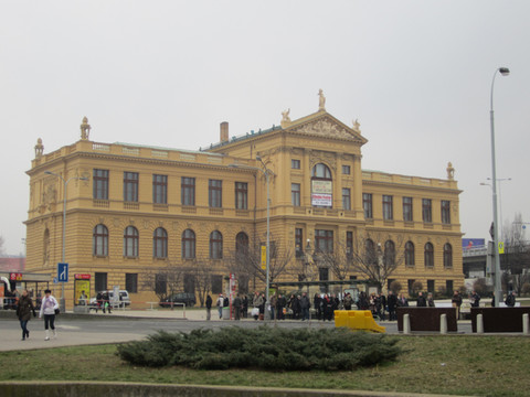 Praha, úAN Florenc - 这栋黄色的建筑的左侧是地道出口 ; 建筑的背后即主要的巴士站-- Florenc ;