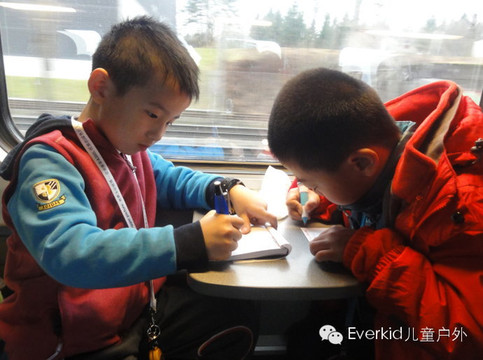 我们从机场步到不到三分钟就到达火车站,小营员们马上就被窗外壮丽的雪山风景吸引,拿起相机拍个不停。一阵拍照后,小营员们拿起日记本马上写下了自己的感受,有的用画画代替。