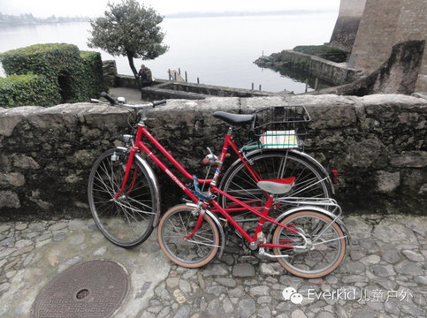 古堡边摆放的亲子自行车。