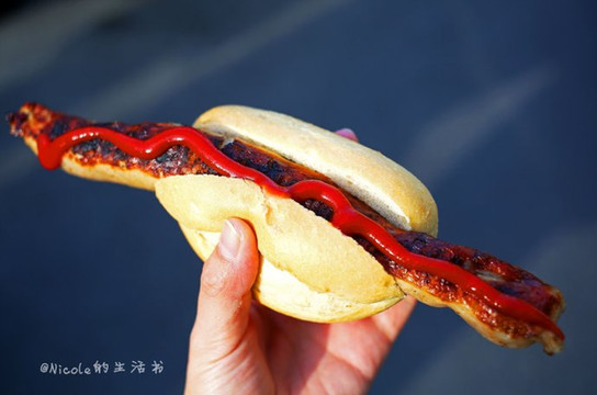先来个热狗尝尝,第一次见到这么长的狗啊,哈哈。来吃到的第一根香肠,味道还不错,就是太咸了点,幸好配着面包可以缓解一下。