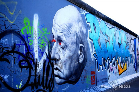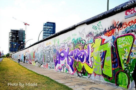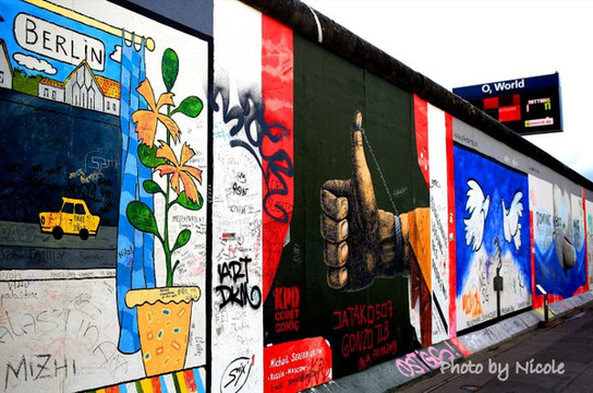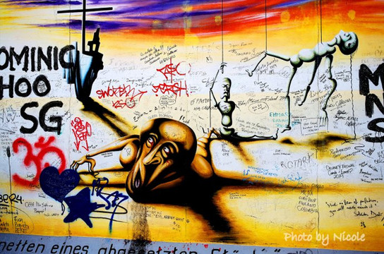 体育馆对面的就是墙了,完全想不到,这座充满彩绘的、极具现代感的墙壁就是墙,让我惊叹之余忍不住仔细玩味,每一幅画都象征着不同的意义,背后都有耐人寻味的故事,恕我不能一一表述清楚每幅画的意义,大家还是看图吧。