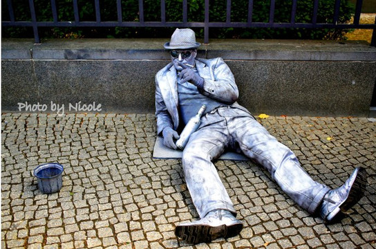 沿着旁的公路走,一路上遇到好几个行为艺术家,都将自己装扮成不同风格的雕塑,如果行人扔硬币在他面前的铁桶里,他会突然做出一些唬人的动作或说几句话,很有意思。
