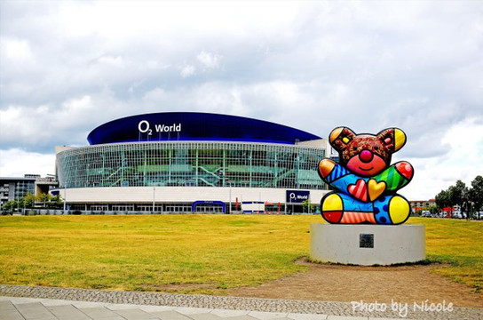 到达目的地之后,下车就看到这座卡哇伊的大熊和它身后的O2 World体育馆,我们的著名钢琴家朗朗还曾经在这里演出过呢。