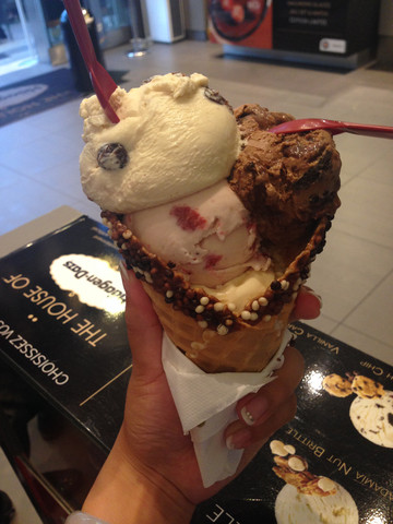 饱餐一顿也没有吃完,只能打包带走宵夜。随后在隔壁的一家哈根达斯买了一个四球的蛋筒,以满足我天天想吃冰淇淋的那一个小小的愿望(好像是14欧),哈哈,实在是太爽啦。