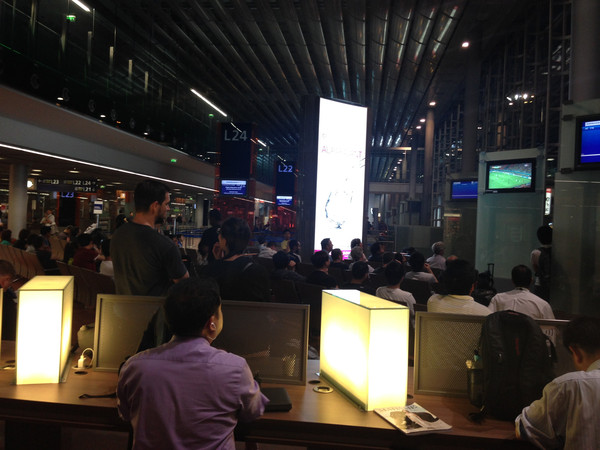 此航班的男士们倒是正好,直接在机场吃喝,开始看起世界杯了,哈哈~