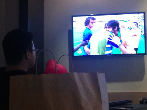 回到酒店,老公电视调好频道,吃的放好~准备看世界杯的开幕赛,巴西vs克罗地亚,那时才巴黎时间10:00哦~老公很得意不用熬夜看球,哈哈~ 这球踢得。。。就不谈了,连我个外行都看出来了~
