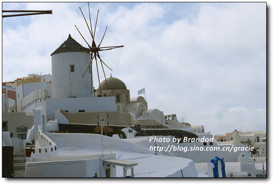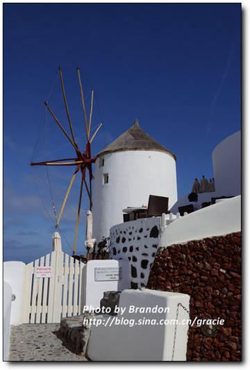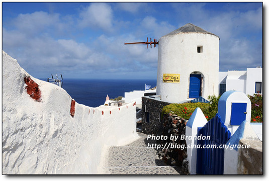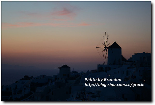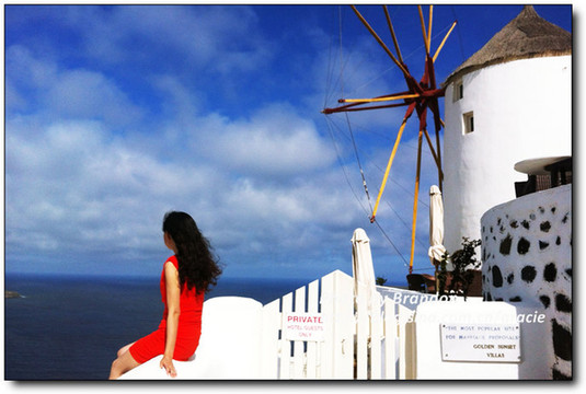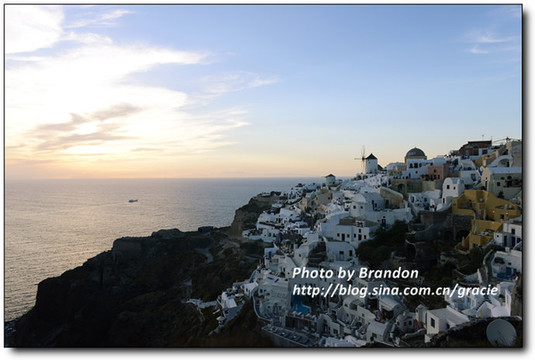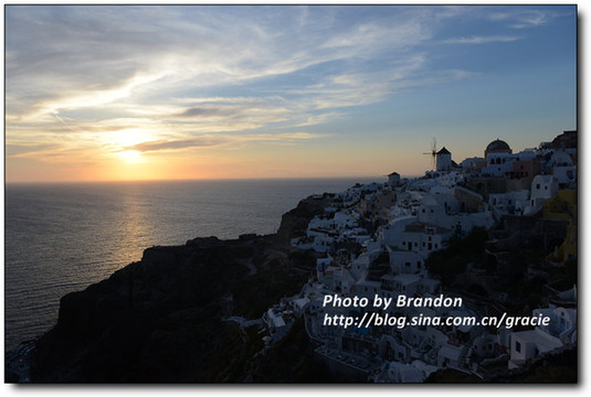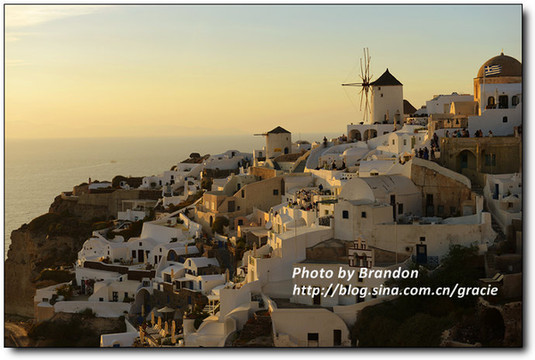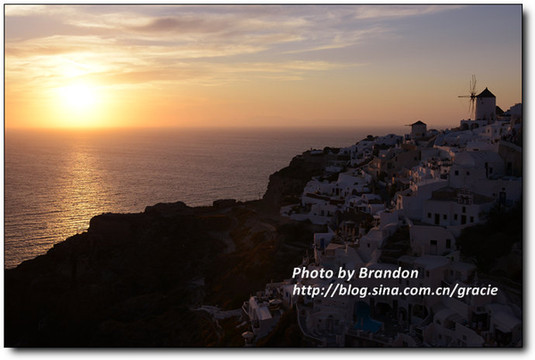 圣岛的西端在广阔的海面上戛然而止,形成一个陡峭的悬崖,很多白房子不畏强劲的海风在悬崖上落脚,由最高处的风车谷仓率领着,每天为太阳送最后一程。悬崖的顶端有一处废弃的瞭望台,如今成为观看日落的最佳地点。