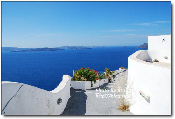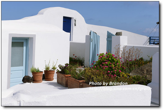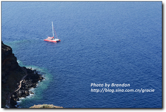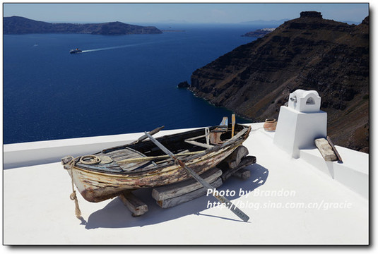 爱琴海的蓝肆意张扬、不管不顾,从每一个转角、每一个豁口倾泻进来,带着轻灵跃动的光线。白色的房子,蓝色的房顶或是红色的门和窗都只是为了衬托点缀她的蓝。圣岛是个狭长的岛屿,岛的顶端望出去,左右两边都是爱琴海,海上几叶小舟在水面上拉出白色的线,划开这浓浓的蓝色,随即又消失在其中。从前,当每日在海边翘首期盼的爱琴国王悲伤地纵身一跃时,是否已被这纯粹的蓝色蛊惑已久,等不及爱子闷休斯的船驶到岸边,看看那黑色的帆是否真的带着坏消息,便迫不及待地把自己交付给这一片蔚蓝。