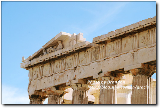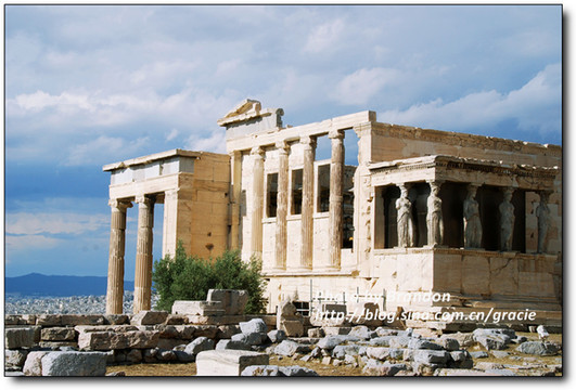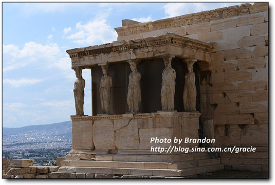 和帕特农神庙的恢弘气势不同的是,三位男神的神庙却设计得精巧别致。墙外的六尊卡里亚特德雕像据说是依照当时最美的六位少女雕刻而成,算是献给男神们特别的礼物。千百年来,她们代表过去和现在的人们站在这里,注视着雅典的沧海桑田。