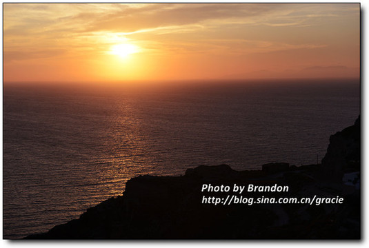 日近黄昏,散落在小店、餐厅和咖啡馆的人们陆续走出来,慢慢向岛的最西端聚拢。八点钟,西边的云层后面渐渐露出绯红。爱琴海收起蓝色罗衫,穿上五彩霞披。海面上云蒸霞蔚,金光万道,风车和白房子都如愿以偿地被镀上了金色。夕阳在海上缓缓前行,尽情挥洒色彩,最后优雅地谢幕,留下紫霞满天。