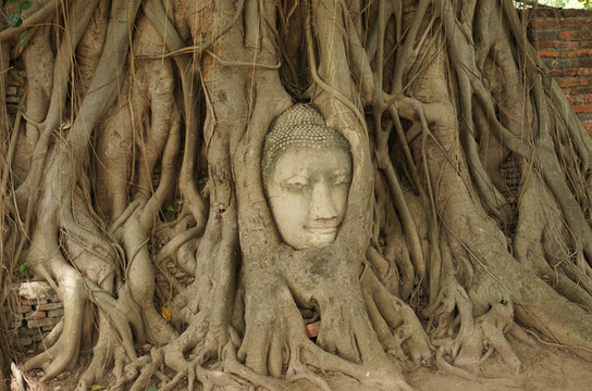 (跋涉几多路程走进,只为与菩提树下沉默了四百年的佛头谋求一面,看一看毁于战火的面孔,是如何在菩提树的眷顾下永世安详。城垣废墟的包围中,树脉枝藤沿着佛面的轮廓交错盘布,如菩提伸出万千掌心,洗涤硝烟的冰冷。)
