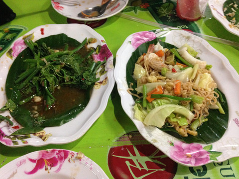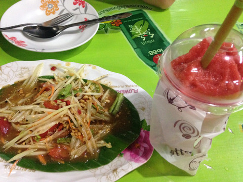 到宾馆洗澡休息后,准备吃个大餐,补偿一下中午饿过的肚子。出了宾馆一拐,进了本地的一个市场,顿时被地道的菜吸引了。是个旅游大国,一般的餐馆都有英文菜单,部分还有中文菜单,点菜也都能听懂英语。但这个市场纯粹是为本地人服务的,菜单全是泰文,服务员也听不懂英文。我们点菜只好指菜单的图片或者别的餐桌上的菜。这些小餐馆虽然外观破烂,但实在是风味地道,价格便宜。我们美餐一顿,仅200铢。