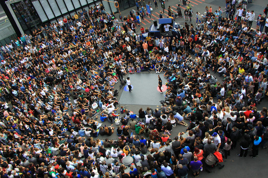 但是我在却见到了最狂野的街舞,上千的市民聚集在旅馆旁高架桥下的一块空地上,围观一个不到二十平方的一块广场上上演的几个民间艺人的街舞,那真是欧洲的民主!呼喊声震耳欲聋,街头舞者从容地跳着疯狂的舞蹈,一声呼啸,人们都举起了自己手中的小牌,选举跳得最好的。那不过是一场街头几个舞者的表演,没有门票,舞台还是舞者自己搭建的,音响也是他们自己带来的。那种自发的狂欢,使我目瞪口呆,完全颠覆了我对世俗的感观。那天是周末,是狂欢的夜晚,酒吧里聚满了年轻人,外边,从车窗里探出上半身的年轻人啸叫着,车的急驰声不绝于耳。第二天早上,我拎着相机在转,感觉又变了。其实是那种沉静的商业城市,铅云低沉,河泛着黯淡的粼光,小巷里静静地走着一些早起的市民,教堂沉静着。