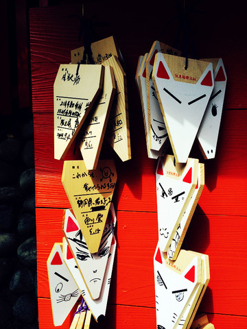 白狐是伏见稻荷大社的标志吉祥物,白狐牌可以用来许愿,也可以根据自己的创意给白狐画上几笔。