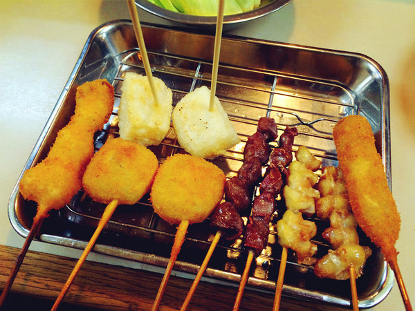 的串烧最有名的除了包在外面的那层粉团以外,蘸酱也是非常有学问的,很多店有一个大大的蘸酱桶,不需要你倒入小碟子里而是直接蘸,但是只允许蘸一次来保证卫生。我们去的那天正好看到有外国游客把咬了一口的串烧准备再蘸一次被服务员制止,之后懊恼的表示:哎呀,真丢脸,我完全不知道有这事儿。所以在这里也正好提醒一下准备去那里的朋友们。