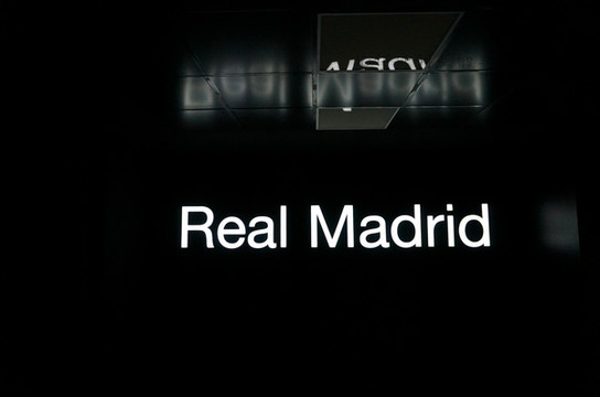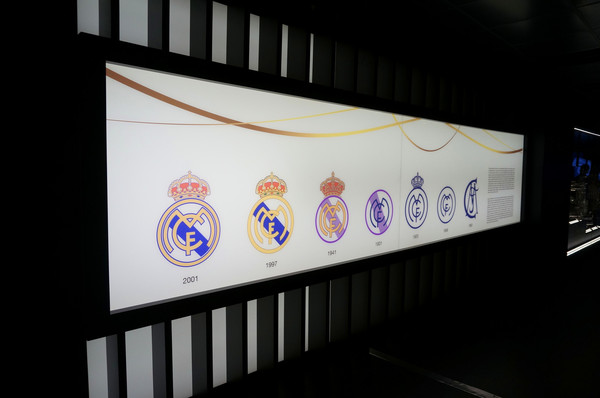 (球场的球队历史展示馆液晶显示的Real Madrid(皇家)Logo)