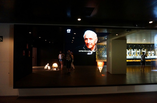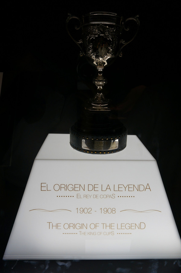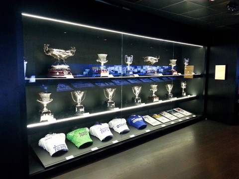 穿过走道来到皇家足球队俱乐部荣誉室。这里展示了百年来球队的荣誉。有各式奖杯、球衣、球鞋、比赛用球,另一边的墙壁上的液晶屏有着球队的精彩集锦,配以激情的音乐和配音,效果着实令人震撼。