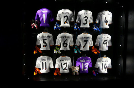 球衣展示1柜,卡西、C罗、贝尔、本泽马等大牌都在这里。