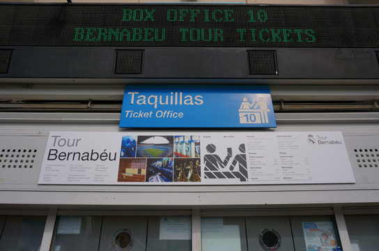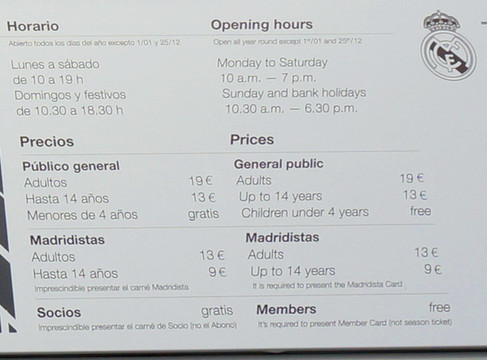 开放时间及票价表(2014年8月21日摄于伯纳乌球场售票处)