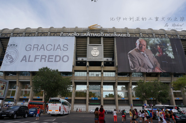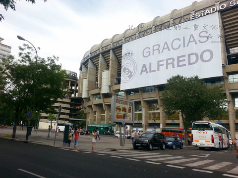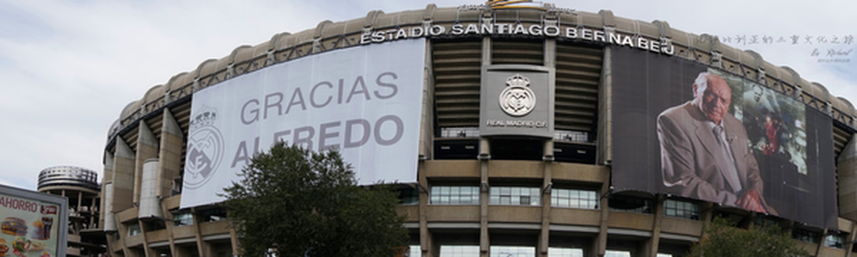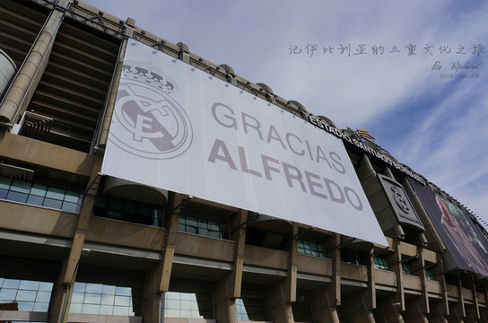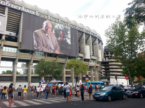 在这次来到伯纳乌球场正逢2014年7月7日皇家队的传奇巨星阿尔弗雷多·迪·斯蒂法诺(Alfredo Di Stéfano)去世,我们到达伯纳乌球场就远远望见球场正立面两侧分别悬挂着感谢标语和迪·斯蒂法诺大幅的肖像照,其中左侧标语用西班牙语写着:阿尔弗雷多,谢谢!