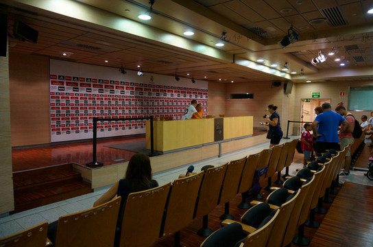 更衣室后面就是新闻发布会场,赛后主教练和明星球员就在这里接受媒体采访。游客们依次排队在发布台上开会。