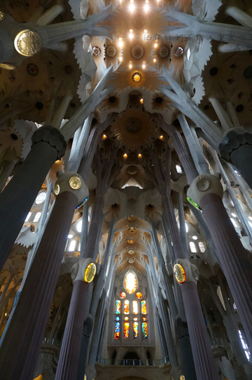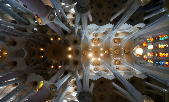 高耸的立柱及其伸出的枝干如参天大树般擎起枝繁叶茂、花朵绽放般的穹顶,又让人恍若漫步异域空间,奇特的建筑结构表现形式耐人寻味。凝神观察,光线与建筑的对话无处不在,高迪精妙的采光和灯光设计,使得教堂内部的光线以多种形式和色彩游离变换,产生奇妙的幻境。建筑的交响在这里响起并且凝固。