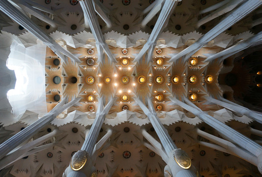 高迪常称其作品像一棵树一样生长着。大量波浪曲线和自然万物的建筑形式,取代了冰冷无生气的支撑结构和平面方角,圣家族大教堂的每一根柱子、每一堵墙面,不仅荷载了建筑物,也表现出灵动的活力。