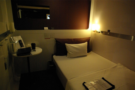 搜来搜去,最后在Agoda的网站搜到一家叫做First cabin的酒店,位置不错就在难波车站附近,价格400多元,于是我就立刻预约并付了房费。只是,在付钱之前我似乎连房间的详情都没有仔细看。在关闭那个预约界面之前的一霎那,我突然看到一个“4平方米”这个关键词。顿时有点傻了,4个平方,这还是房间么?