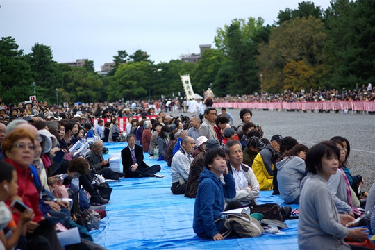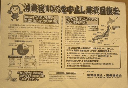但是,如今的看似同样的严谨,思想却异常自由活跃,而且可以充分表达。在高槻的JR车站的天桥上面,我听到不远处传来很大声的噪音,这种情况在以安静著称的真是相当少见。走近一看,原来是有一个人在拿着喇叭大声地说着什么,他旁边还有几个同伴向路人不断地散发着传单,我也拿了一张。传单上的标题是“中止消费税10%,回复景气。”原来,这是一个叫做消费税废止高槻联络会的组织在表达他们反对增税的观点。如此大声的宣传,却没有招来任何人的干涉。这是因为民生的问题不能沉默,必须大声表达出来,让所有人知道!