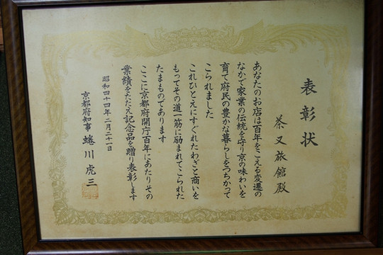 这个茶又旅馆的住宿费用400元,住宿的体会相当令人满意。离开的时候,我看到两样特别的东西,是当年成立100周年的时候知事颁发给茶又旅馆的,一个是“老铺”的牌子,还有一个奖状,表彰了这个保持了传统文化的日式旅馆。