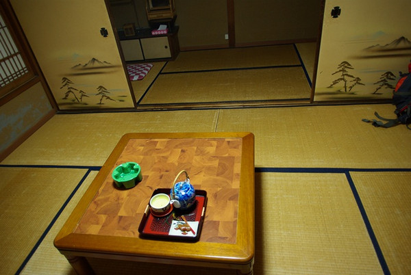 茶又旅馆,是典型的日式旅馆。进门的时候需要先脱鞋,然后上到比地面高出两个台阶的房内。里面全是木地板,走起来有一种沉沉的扎实感,我的房间在二楼,里面都是榻榻米,房间意外的宽敞,足足有10个榻榻米那么大。一个榻榻米相当于1.7个平方米,房间就有17个平方左右,在这是相当宽大的住处了。