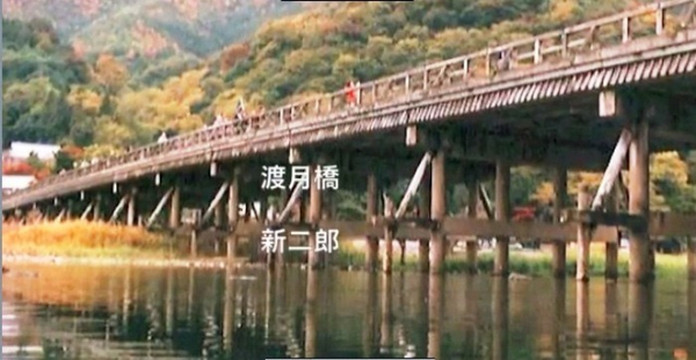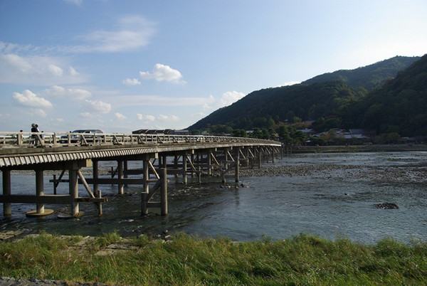 我们继续往前走,前方有一座桥梁非常的惹人注目,不用说这就是著名的。始建于的承和年间(834年 - 848年)。当年的龟山上皇在桥上看到皓月当空,正好从桥的上方经过,好似明月渡过的感觉,于是便由此得名(摘自维基百科:亀山上皇が、橋の上空を移動していく月を眺めて「くまなき月の渡るに似る」と感想を述べたことから渡月橋と名付けられた。)。这个名字,带给人非常美妙的意境。