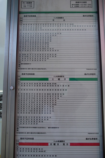 普通的公交车站牌,不外乎表明公交车的路数,本站名称,收发时间等等,但是的公交车站牌还有一个特色,就是会标注到达时间,就像火车时刻表一样。这样,等车的时候就很清楚地知道下一班车什么时候能到,或者说需要等多久才有车来,这个信息可以说是非常重要。比如,以这张照片为例,车次是11路,方向是到JR高槻车站,我们看10点钟的那一排:01,02,07,13,19,22,25,28,31,37,41,43,50,58。这每一个数字都说明了到达这个站牌的时间。比如你是10:15分到那儿,那么就很清楚地知道下一班车是10:19到达。