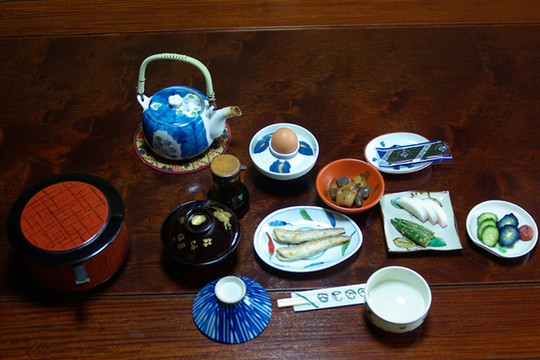 我的住宿是带早餐的,那么早餐又是什么样子的呢?次日上午八点,老太太准时预备好了早餐,在楼下叫我去用餐。这个吃饭的地方同样古色古香,无论食具,食物,还是房间,都是非常传统的式样,精美并且富于内涵,令人大为愉悦。只是我还不习惯盘腿坐,不知道该如何就坐才好。