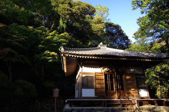 我们走过,上游的河流叫做保津川,色泽深绿,更加迷人。虽然还不是旅游旺季也是人潮涌动,各类商铺摊贩众多。这个场景又是我不太喜爱的商业旅游的氛围。好在而我们两人都不是喜欢过于热闹的人,于是出家人说我带你去一个特别的地方。我们上了一个小坡,那儿有一块小空地,上面有两块大石头,石头上似乎刻有字样。