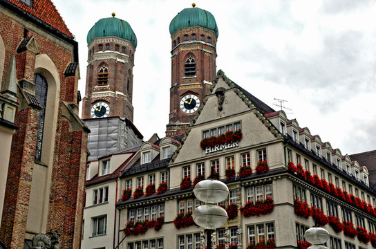 女士们都钻进了商店,只剩下小刘陪我前去。位于广场的西北角,有两个绿色“洋葱头”尖顶的双塔建筑的就是(Frauenkirche),很好认。从上只能看到两个洋葱样的圆顶。那是最吸引人们目光的标志性建筑。教堂建于1488年,属于晚期的哥德式建筑。北钟楼塔高99米,南钟楼塔高100米,是全市最高的建筑物。这个可以同时容纳20,000人做礼拜的教堂里光线很暗,两边有很多精美的壁画和彩画玻璃。因为看了许多相似的教堂,有点审美疲劳,没呆多久就出来了。