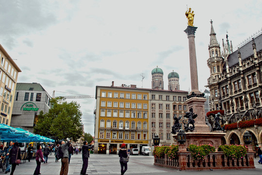 来到这个城市,我们首先要去的就是位于市中心的,那里是老城区的市中心。每天云集着来自世界各地的许多观光客和购物者,我们团队几个女士的心早已飞到那里了。8:20我们把车停靠在近卡尔斯托大门(karlstor)旁边的停车场,沿热闹的购物街向东走向玛丽亚广场。从卡尔斯托门开始到的这一路上,遍布着众多百货商店、餐馆、超市,服装店,品牌专卖店、咖啡吧和水果摊。街上游人如织,好不热闹!