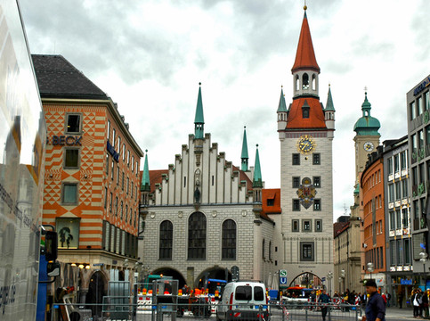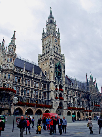 广场的北面矗立着1908年建成的新市政厅。这座19世纪末建造的棕黑色哥特式建筑的正面装饰有巴伐利亚国王、传说的英雄、圣人以及寓言等雕像。在其高85米的钟楼上,有著名的玩偶报时钟,每天上午11点与下午5点报时钟的玩偶会伴随着音乐出来,展现1568年威廉五世婚礼大典的场景。(可惜我们因赶时间在10:40离开,没有看到这一幕)。