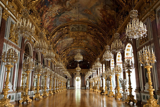 皇宫中最辉煌的要数长达98米的大镜厅,里面的蜡烛全部点亮需要几个小时,无论白天阳光照射还是夜晚几千只烛光闪烁,都宛若仙境。整个镜厅配备着巨大的枝型水晶吊灯,和金光锃亮的烛台,墙壁嵌有由屋顶延伸至地板的硕大明镜,天花板上绘满了油画。当厅内上千根蜡烛全部点亮的时候,试想一下,镜厅里会是何等灿烂辉煌!