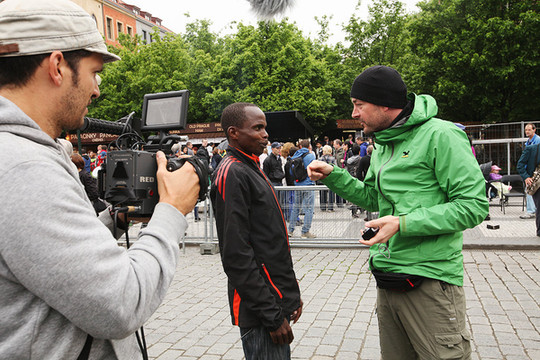碰巧这日举行马拉松赛事,电视台正在采访夺冠选手