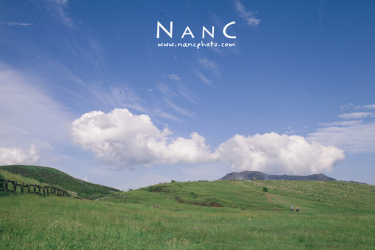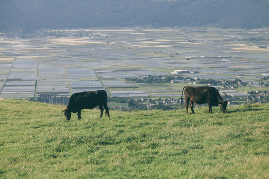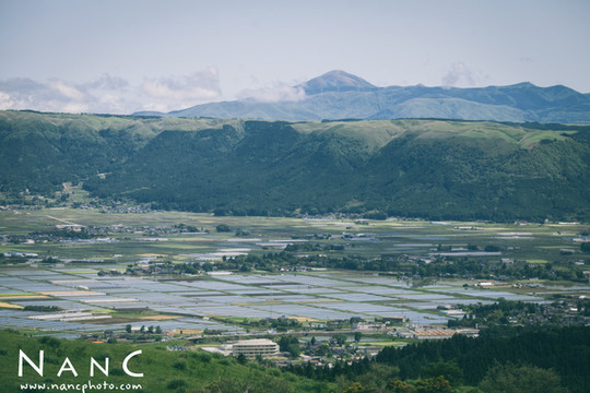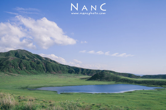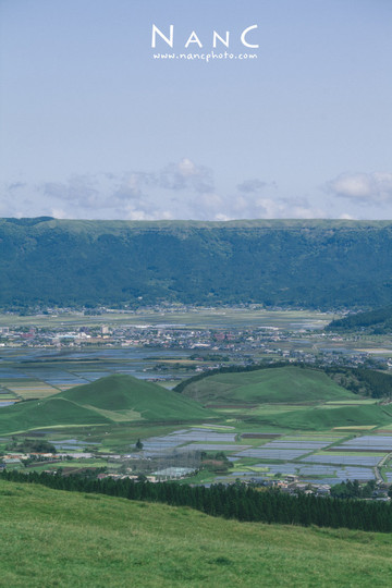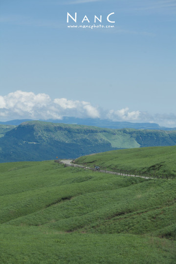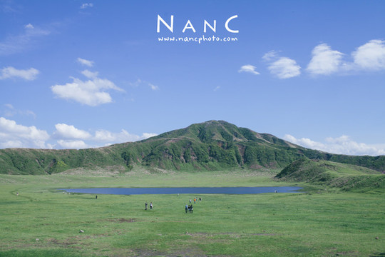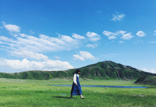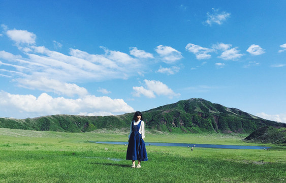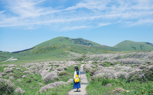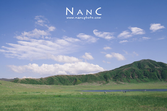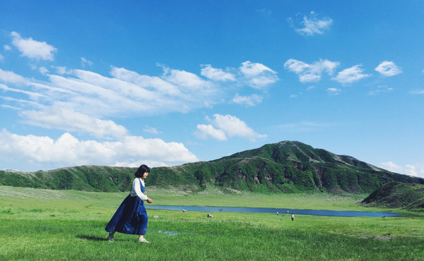 草千里是指鸟帽子岳(阿苏五岳之一,海拔1337米)中腹的广阔草原。乌帽子岳北坡山腰处有一被火山灰覆盖的草原,春秋季可放牛马,冬季则可作滑雪、溜冰场等,这在全世界也是少见的,也是日本首屈一指的利用大草原自然的观光地。草千里原来也是火口,却披覆着大片绿草,位于阿苏山西,草原内有2个池塘,干旱季节,池水蒸发,待雨季来临后又形成池。冬天,池水结冰,又成为天然溜冰场。草原内,零零散散的几匹牛、马有的悠闲地溜达。每年4月~11月,游客可以在草原上骑马奔跑。与这里略带枯黄的草地相比,反而是下山路上见到的、比之海拔要低的那些草原显得很生机勃勃、青翠欲滴。山麓牧草丰茂,登上外轮山北壁的大观峰,可以眺望阿苏山全景。