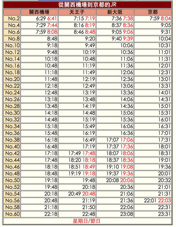 關西機場到天王寺的行駛時間約30分鐘、到新大阪約50分鐘、到京都約75分鐘,每天開出48班車(往返24個班次)。