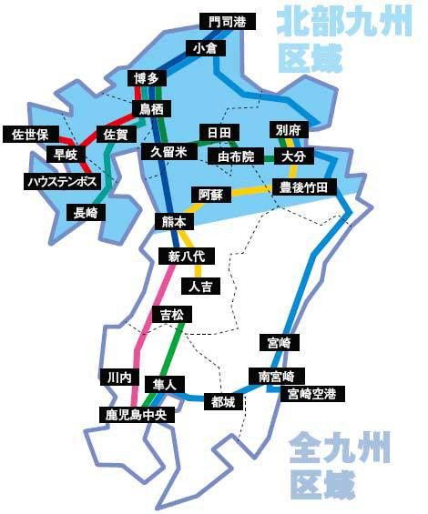 车站售票处:博多站,门司港站,小仓站,别府站,佐贺站,长崎站,大分站,熊本站,鹿儿岛中央站,宫崎站,宫崎机场站;