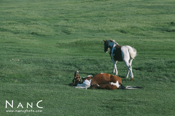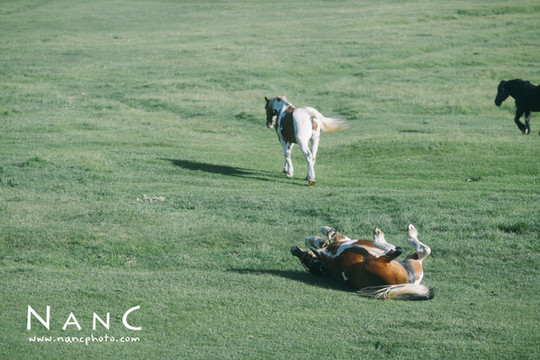游客们纷纷离开草原后,被关起来的马儿们就自由啦,高兴的在草地里打滚。