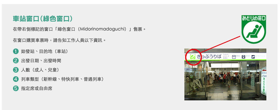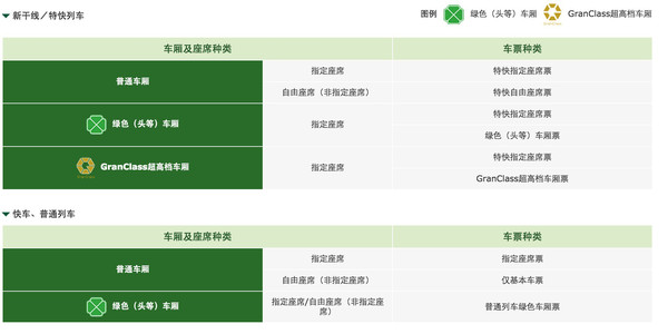 乘坐新干线、特快列车的绿色(头等)车厢时,除基本车票外还需购买特快车票及绿色(头等)车厢指定座席票。