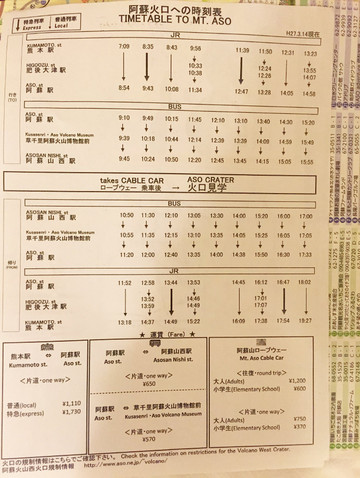 下图是阿苏火山-阿苏站的时间表。注意!最后一班从阿苏火西站回阿苏站的巴士时间是17:00。阿苏站到熊本站的最末一班列车时间是18:02。