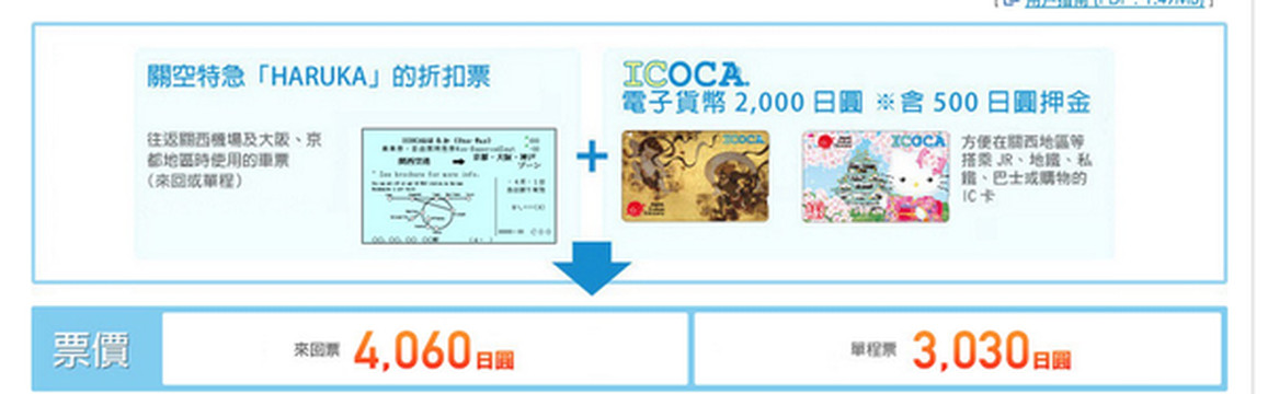 “ICOCA&HARUKA”是指,将乘坐关西地区等处的JR和地铁、私营铁路、公交车等交通工具以及购物时使用的IC卡“ICOCA”(卡中预存有1,500日元,200日元的手续费),以及从关西机场直达天王寺、新大阪和京都的关西机场特快车“HARUKA”折扣券组合成套的优惠套票。