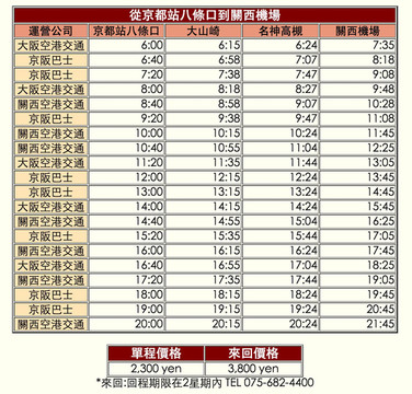 2.大巴:从关西机场到大阪站前约50分,单程1900日元;到京都站八条口约88分钟,大人单程2200日元。