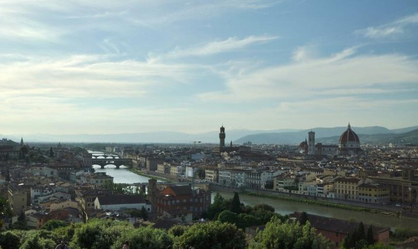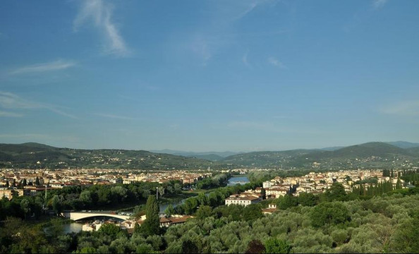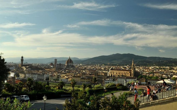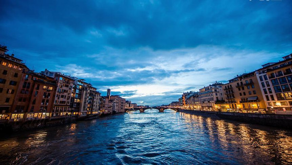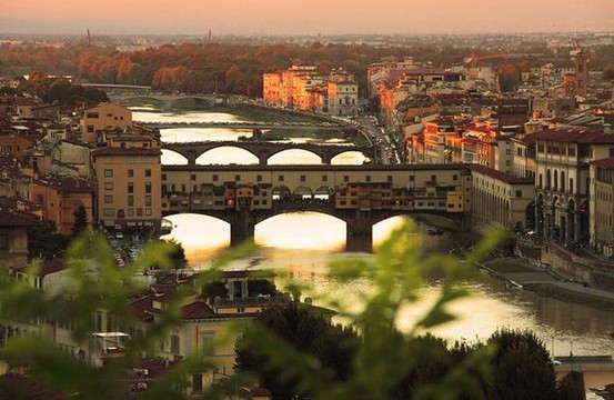 站在米开朗基罗广场俯视佛罗伦萨,古老的城市笼罩在一片浮靡的暖色中,阿诺河绕城静静流过,蔷薇色的屋顶在暮色中与天边的晚霞交相映衬,朦朦胧胧的美透出一股盛世犹存的奢华,美得令人屏息。